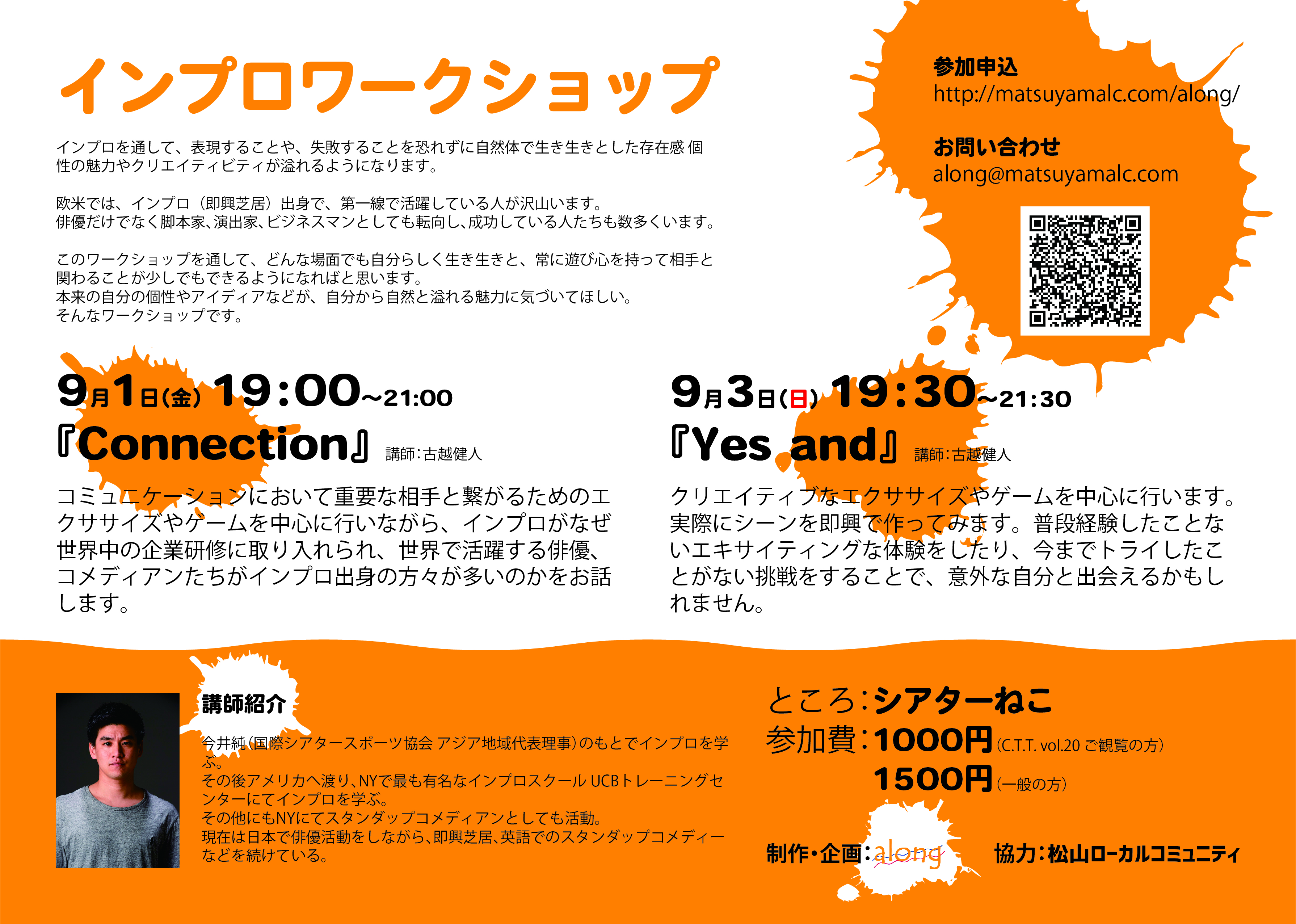 当日会場にてに『C.T.T.松山 vol.20』のチケットのご提示が必要です。9月1日(金)『Connection』へ参加の方は ご購入済みチケットを、9月3日(日)『Yes and』へ参加の方は、チケット半券をご持参ください。